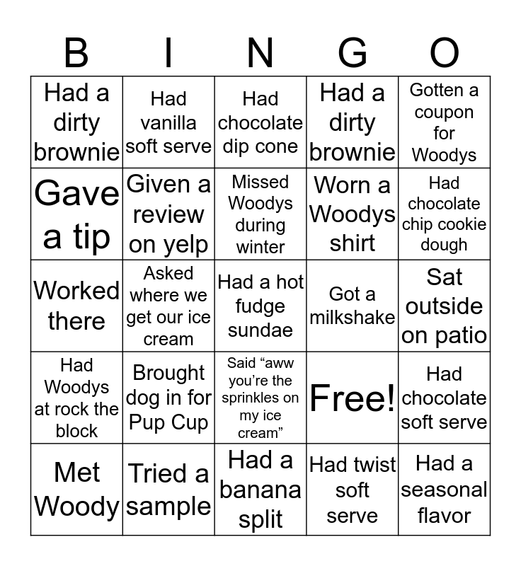 This bingo card has 25 words: Brought dog in for Pup Cup, Had a banana split, Missed Woodys during winter, Met Woody, Gotten a coupon for Woodys, Had a dirty brownie, Gave a tip, Had vanilla soft serve, Got a milkshake, Said “aww you’re the sprinkles on my ice cream”, Worn a Woodys shirt, Worked there, Free!, Had chocolate soft serve, Given a review on yelp, Had a seasonal flavor, Sat outside on patio, Had chocolate dip cone, Had chocolate chip cookie dough, Asked where we get our ice cream, Had a hot fudge sundae, Tried a sample, Had Woodys at rock the block, Had a dirty brownie and Had twist soft serve.