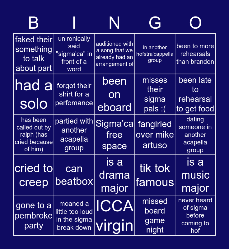 This bingo card has a free space and 24 words: can beatbox, moaned a little too loud in the sigma break down, been on eboard, gone to a pembroke party, been to more rehearsals than brandon, faked their something to talk about part, had a solo, unironically said "sigma'ca" in front of a word, fangirled over mike artuso, is a drama major, misses their sigma pals :(, has been called out by ralph (has cried because of him), tik tok famous, is a music major, forgot their shirt for a perfomance, missed board game night, dating someone in another acapella group, auditioned with a song that we already had an arrangement of, been late to rehearsal to get food, partied with another acapella group, never heard of sigma before coming to hof, cried to creep, in another hofstra'cappella group and ICCA virgin.