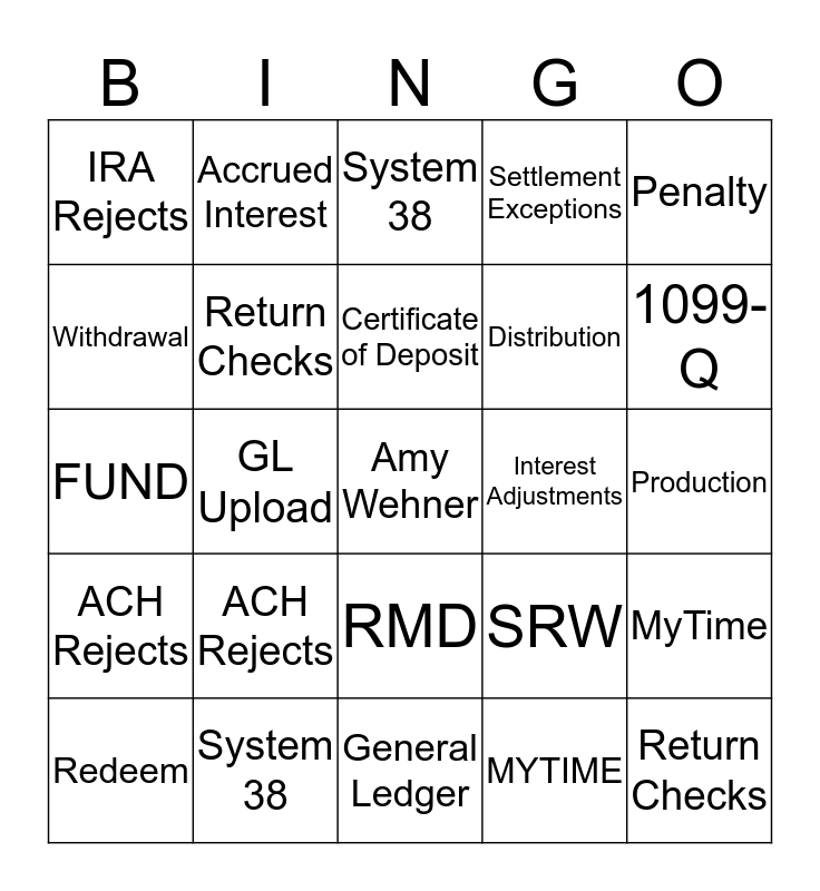 This bingo card has a free space and 24 words: ACH Rejects, System 38, Certificate of Deposit, Redeem, Penalty, IRA Rejects, Withdrawal, Accrued Interest, Interest Adjustments, RMD, Distribution, FUND, SRW, MyTime, Return Checks, MYTIME, Production, System 38, 1099-Q, GL Upload, Return Checks, ACH Rejects, Settlement Exceptions and General Ledger.