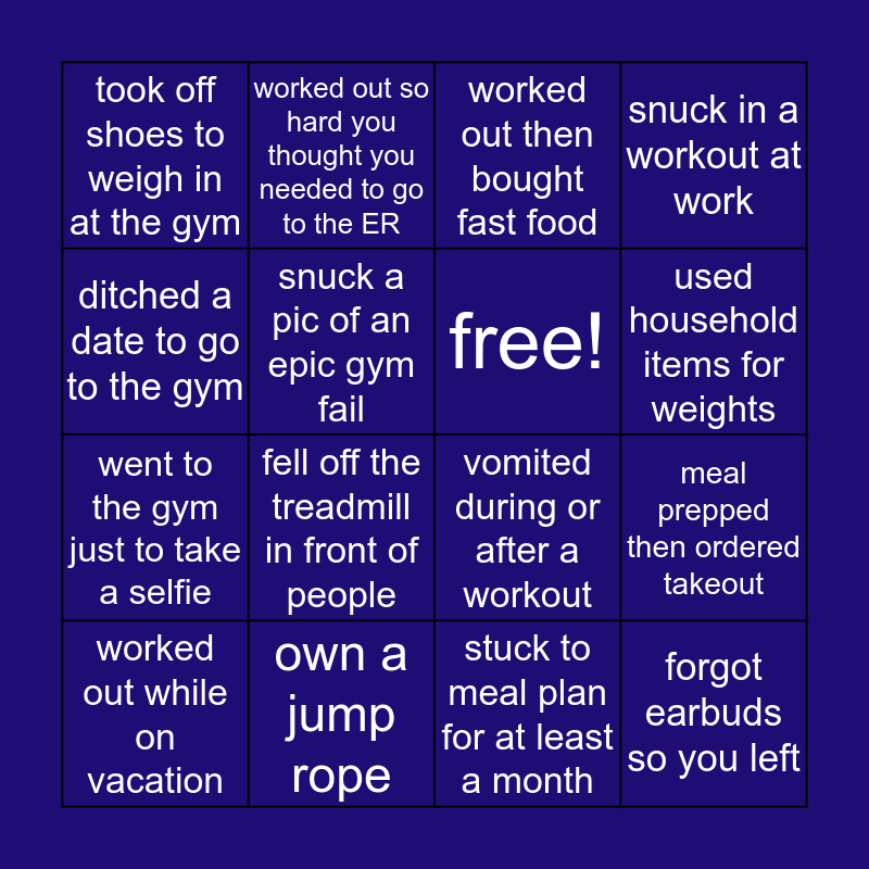 This bingo card has 16 words: worked out while on vacation, own a jump rope, worked out then bought fast food, snuck in a workout at work, ditched a date to go to the gym, worked out so hard you thought you needed to go to the ER, vomited during or after a workout, meal prepped then ordered takeout, took off shoes to weigh in at the gym, snuck a pic of an epic gym fail, stuck to meal plan for at least a month, used household items for weights, went to the gym just to take a selfie, fell off the treadmill in front of people, free! and forgot earbuds so you left.