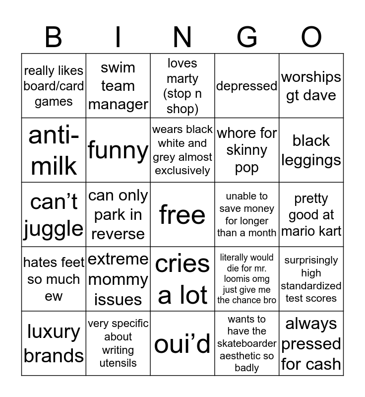 This bingo card has a free space and 24 words: extreme mommy issues, very specific about writing utensils, wears black white and grey almost exclusively, luxury brands, worships gt dave, really likes board/card games, anti-milk, swim team manager, unable to save money for longer than a month, cries a lot, whore for skinny pop, can’t juggle, literally would die for mr. loomis omg just give me the chance bro, surprisingly high standardized test scores, funny, wants to have the skateboarder aesthetic so badly, pretty good at mario kart, loves marty (stop n shop), black leggings, can only park in reverse, always pressed for cash, hates feet so much ew, depressed and oui’d.