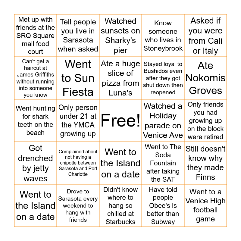 This bingo card has a free space and 24 words: Complained about not having a chipotle between Sarasota and Port Charlotte, Drove to Sarasota every weekend to hang with friends, Ate a huge slice of pizza from Luna's, Went to the Island on a date, Asked if you were from Cali or Italy, Met up with friends at the SRQ Square mall food court, Can't get a haircut at James Griffiths without running into someone you know, Tell people you live in Sarasota when asked, Watched a Holiday parade on Venice Ave, Went to the Island on a date, Stayed loyal to Bushidos even after they got shut down then reopened, Went hunting for shark teeth on the beach, Went to The Soda Fountain after taking the SAT, Still doesn't know why they made Finns, Went to Sun Fiesta, Have told people Obee's is better than Subway, Only friends you had growing up on the block were retired, Watched sunsets on Sharky's pier, Ate Nokomis Groves, Only person under 21 at the YMCA growing up, Went to a Venice High football game, Got drenched by jetty waves, Know someone who lives in Stoneybrook and Didn't know where to hang so chilled at Starbucks.