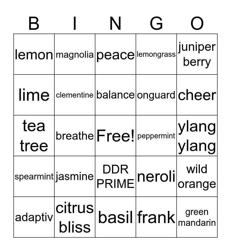 This bingo card has a free space and 24 words: jasmine, citrus bliss, balance, adaptiv, juniper berry, lemon, lime, magnolia, peppermint, DDR PRIME, onguard, tea tree, neroli, wild orange, clementine, frank, ylang ylang, peace, cheer, breathe, green mandarin, spearmint, lemongrass and basil.