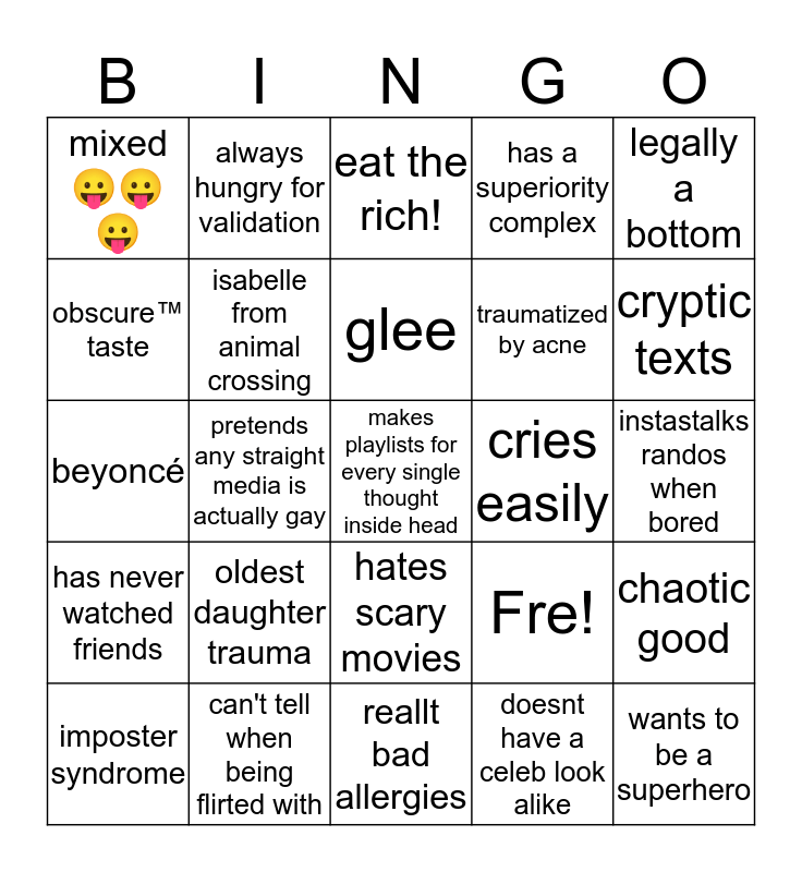This bingo card has 25 words: oldest daughter trauma, reallt bad allergies, glee, imposter syndrome, legally a bottom, mixed 😛😛😛, obscure™ taste, always hungry for validation, cries easily, hates scary movies, traumatized by acne, beyoncé, Fre!, chaotic good, isabelle from animal crossing, wants to be a superhero, instastalks randos when bored, eat the rich!, cryptic texts, pretends any straight media is actually gay, makes playlists for every single thought inside head, can't tell when being flirted with, has never watched friends, has a superiority complex and doesnt have a celeb look alike.