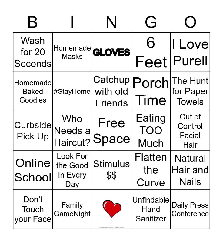 This bingo card has 1 images, a free space and 33 words: Social Distance, Unfindable Hand Sanitizer, Neighborhood Walk, Toilet Paper Wars, Online School, #StayHome, I Love Purell, Don't Touch your Face, Homemade Masks, Zoom Meeting, Catchup with old Friends, GLOVES, America Loves Dr Fauci, Closet Cleaning, Eating TOO Much, The Hunt for Paper Towels, Family GameNight, Curbside Pick Up, Look For the Good In Every Day, Flatten the Curve, Stimulus $$, Work from Home, Wash for 20 Seconds, Out of Control Facial Hair, Daily Press Conference, 6 Feet, Gov Cuomo for Prez, Porch Time, Homemade Baked Goodies, Everyday Heroes, Who Needs a Haircut?, Natural Hair and Nails and Time to Read A Book.