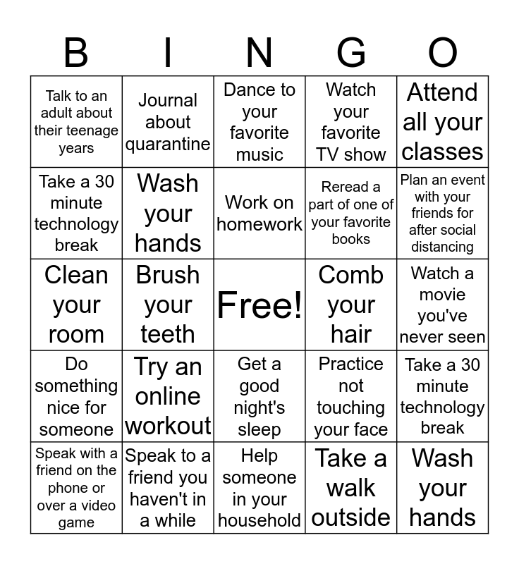 This bingo card has a free space and 24 words: Speak with a friend on the phone or over a video game, Try an online workout, Work on homework, Take a walk outside, Attend all your classes, Talk to an adult about their teenage years, Journal about quarantine, Dance to your favorite music, Comb your hair, Watch a movie you've never seen, Clean your room, Wash your hands, Practice not touching your face, Take a 30 minute technology break, Take a 30 minute technology break, Speak to a friend you haven't in a while, Help someone in your household, Watch your favorite TV show, Plan an event with your friends for after social distancing, Do something nice for someone, Brush your teeth, Get a good night's sleep, Reread a part of one of your favorite books and Wash your hands.
