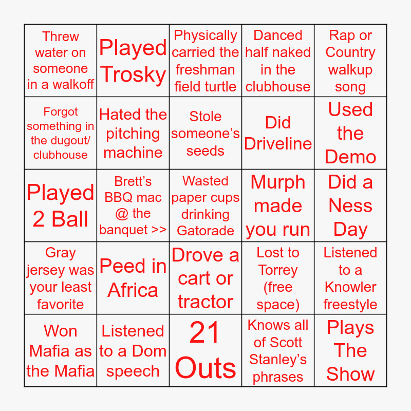 This bingo card has 25 words: Peed in Africa, 21 Outs, Stole someone’s seeds, Won Mafia as the Mafia, Rap or Country walkup song, Threw water on someone in a walkoff, Forgot something in the dugout/ clubhouse, Played Trosky, Murph made you run, Drove a cart or tractor, Did Driveline, Played 2 Ball, Lost to Torrey (free space), Listened to a Knowler freestyle, Hated the pitching machine, Plays The Show, Did a Ness Day, Physically carried the freshman field turtle, Used the Demo, Brett’s BBQ mac @ the banquet >>, Wasted paper cups drinking Gatorade, Listened to a Dom speech, Gray jersey was your least favorite, Danced half naked in the clubhouse and Knows all of Scott Stanley’s phrases.