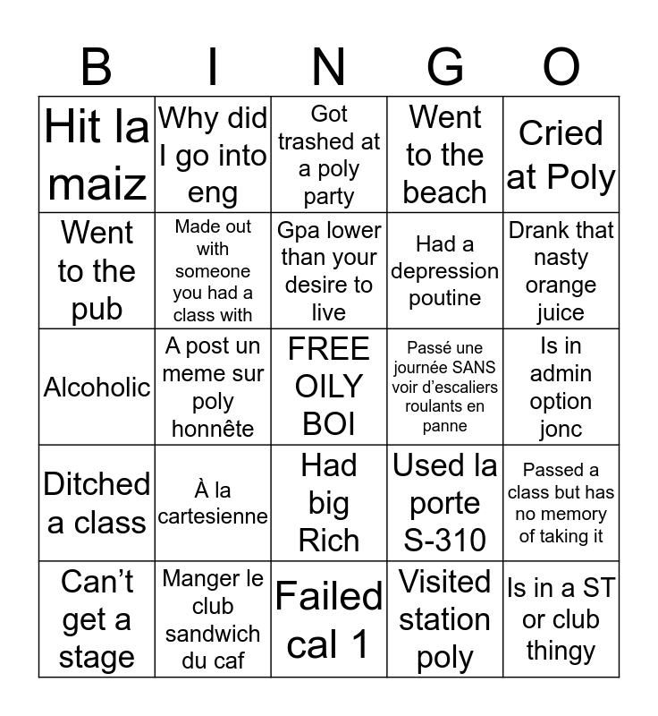 This bingo card has a free space and 24 words: À la cartesienne, Manger le club sandwich du caf, Gpa lower than your desire to live, Can’t get a stage, Cried at Poly, Hit la maiz, Went to the pub, Why did I go into eng, Passé une journée SANS voir d’escaliers roulants en panne, Had big Rich, Had a depression poutine, Alcoholic, Used la porte S-310, Passed a class but has no memory of taking it, Made out with someone you had a class with, Visited station poly, Is in admin option jonc, Got trashed at a poly party, Drank that nasty orange juice, A post un meme sur poly honnête, Is in a ST or club thingy, Ditched a class, Went to the beach and Failed cal 1.