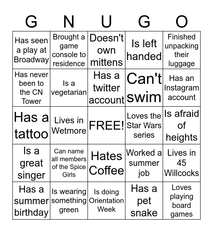 This bingo card has a free space and 24 words: Can name all members of the Spice Girls, Is wearing something green, Has a twitter account, Has a summer birthday, Finished unpacking their luggage, Has seen a play at Broadway, Has never been to the CN Tower, Brought a game console to residence, Loves the Star Wars series, Hates Coffee, Can't swim, Has a tattoo, Worked a summer job, Lives in 45 Willcocks, Is a vegetarian, Has a pet snake, Is afraid of heights, Doesn't own mittens, Has an Instagram account, Lives in Wetmore, Loves playing board games, Is a great singer, Is left handed and Is doing Orientation Week.