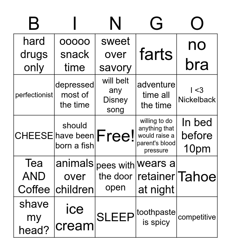 This bingo card has a free space and 24 words: animals over children, ice cream, will belt any Disney song, shave my head?, no bra, hard drugs only, perfectionist, ooooo snack time, willing to do anything that would raise a parent's blood pressure, pees with the door open, adventure time all the time, CHEESE, wears a retainer at night, Tahoe, depressed most of the time, toothpaste is spicy, In bed before 10pm, sweet over savory, I <3 Nickelback, should have been born a fish, competitive, Tea AND Coffee, farts and SLEEP.