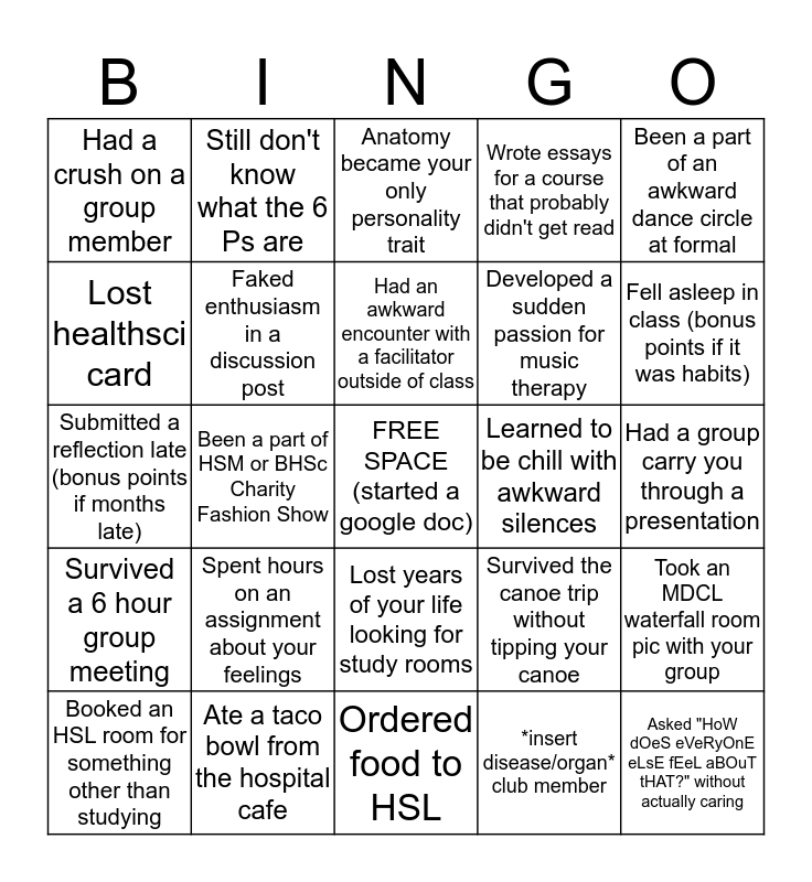 This bingo card has a free space and 24 words: Spent hours on an assignment about your feelings, Ate a taco bowl from the hospital cafe, Had an awkward encounter with a facilitator outside of class, Booked an HSL room for something other than studying, Been a part of an awkward dance circle at formal, Had a crush on a group member, Lost healthsci card, Still don't know what the 6 Ps are, Learned to be chill with awkward silences, Lost years of your life looking for study rooms, Developed a sudden passion for music therapy, Submitted a reflection late (bonus points if months late), Survived the canoe trip without tipping your canoe, Took an MDCL waterfall room pic with your group, Faked enthusiasm in a discussion post, *insert disease/organ* club member, Had a group carry you through a presentation, Anatomy became your only personality trait, Fell asleep in class (bonus points if it was habits), Been a part of HSM or BHSc Charity Fashion Show, Asked "HoW dOeS eVeRyOnE eLsE fEeL aBOuT tHAT?" without actually caring, Survived a 6 hour group meeting, Wrote essays for a course that probably didn't get read and Ordered food to HSL.