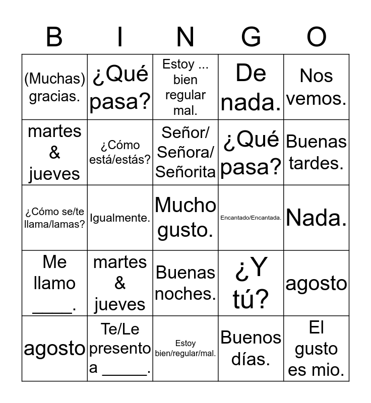 This bingo card has 25 words: martes & jueves, Estoy bien/regular/mal., Señor/ Señora/ Señorita, agosto, Nos vemos., (Muchas) gracias., martes & jueves, ¿Qué pasa?, Encantado/Encantada., Buenas noches., ¿Qué pasa?, ¿Cómo se/te llama/lamas?, ¿Y tú?, agosto, ¿Cómo está/estás?, El gusto es mio., Nada., Estoy ... bien regular mal., Buenas tardes., Igualmente., Mucho gusto., Te/Le presento a _____., Me llamo ____., De nada. and Buenos días..