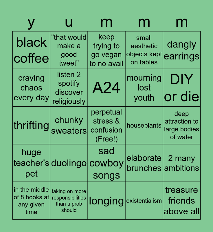 This bingo card has a free space and 24 words: duolingo, taking on more responsibilities than u prob should, A24, in the middle of 8 books at any given time, dangly earrings, black coffee, craving chaos every day, "that would make a good tweet", houseplants, sad cowboy songs, mourning lost youth, thrifting, elaborate brunches, 2 many ambitions, listen 2 spotify discover religiously, existentialism, deep attraction to large bodies of water, keep trying to go vegan to no avail, DIY or die, chunky sweaters, treasure friends above all, huge teacher's pet, small aesthetic objects kept on tables and longing.