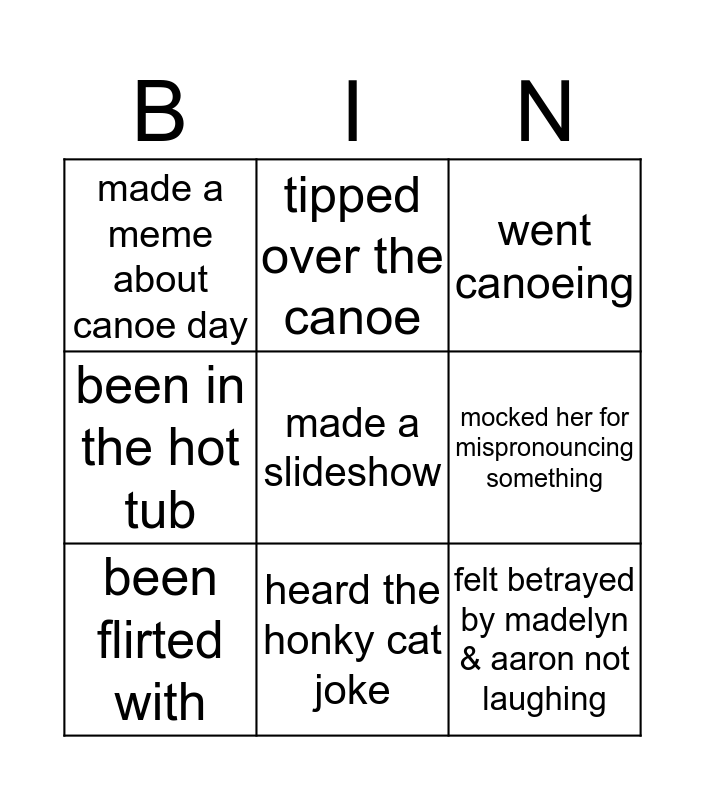 This bingo card has a free space and 24 words: fell in the pond, dragged the canoe back, dragged chloe & kailee back, wore mike nols shorts, felt betrayed by madelyn & aaron not laughing, made a meme about canoe day, tipped over the canoe, went canoeing, been slapped after telling a funny joke, been dragged into chapters, gotten peer pressured into getting high, did not fall in the pond, didn’t understand a reference she made, been called clown, been flirted with, heard her say something that makes No Sense, went to boston pizza, been in the hot tub, heard the honky cat joke, received a sentimental letter, gotten a polaroid taken, has been told, in great detail, about her prophetic dreams, mocked her for mispronouncing something and heard her passionately explain a hot take or fixation.