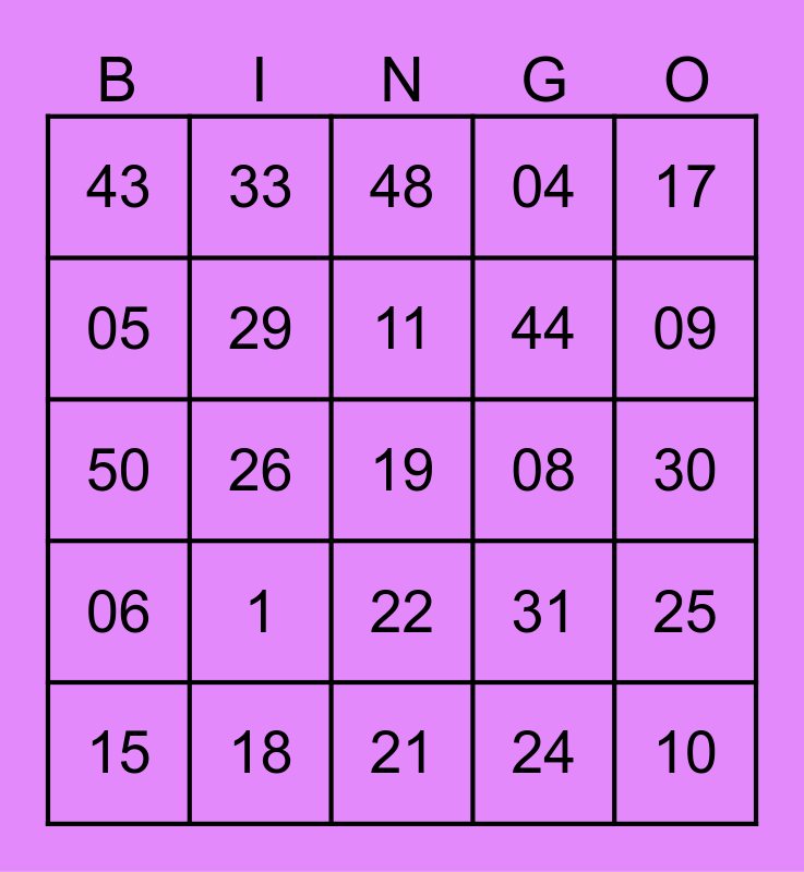 This bingo card has a free space and 24 words: 1, 18, 11, 15, 17, 43, 05, 33, 08, 22, 44, 50, 31, 25, 29, 24, 30, 48, 09, 26, 10, 06, 04 and 21.