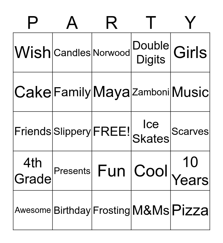 This bingo card has a free space and 24 words: Presents, Birthday, Maya, Awesome, Girls, Wish, Cake, Candles, Ice Skates, Fun, Zamboni, Friends, Cool, 10 Years, Family, M&Ms, Scarves, Norwood, Music, Slippery, Pizza, 4th Grade, Double Digits and Frosting.