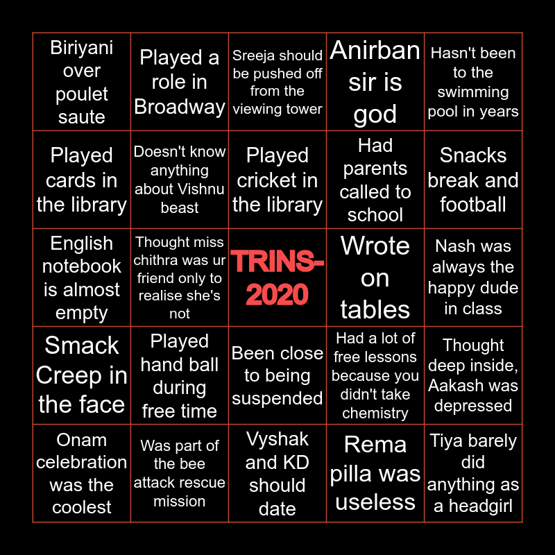 This bingo card has a free space and 24 words: Played hand ball during free time, Was part of the bee attack rescue mission, Played cricket in the library, Onam celebration was the coolest, Hasn't been to the swimming pool in years, Biriyani over poulet saute, Played cards in the library, Played a role in Broadway, Wrote on tables, Been close to being suspended, Had parents called to school, English notebook is almost empty, Had a lot of free lessons because you didn't take chemistry, Thought deep inside, Aakash was depressed, Doesn't know anything about Vishnu beast, Rema pilla was useless, Nash was always the happy dude in class, Sreeja should be pushed off from the viewing tower, Snacks break and football, Thought miss chithra was ur friend only to realise she's not, Tiya barely did anything as a headgirl, Smack Creep in the face, Anirban sir is god and Vyshak and KD should date.