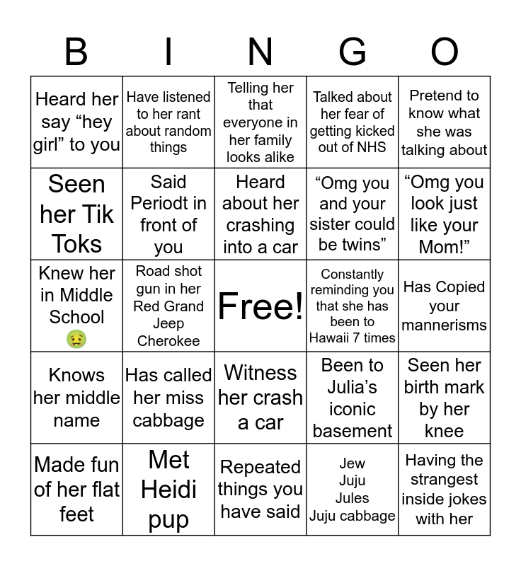 This bingo card has a free space and 24 words: Has called her miss cabbage, Met Heidi pup, Heard about her crashing into a car, Made fun of her flat feet, Pretend to know what she was talking about, Heard her say “hey girl” to you, Seen her Tik Toks, Have listened to her rant about random things, Constantly reminding you that she has been to Hawaii 7 times, Witness her crash a car, “Omg you and your sister could be twins”, Knew her in Middle School 🤢, Been to Julia’s iconic basement, Seen her birth mark by her knee, Said Periodt in front of you, Jew Juju Jules Juju cabbage, Has Copied your mannerisms, Telling her that everyone in her family looks alike, “Omg you look just like your Mom!”, Road shot gun in her Red Grand Jeep Cherokee, Having the strangest inside jokes with her, Knows her middle name, Talked about her fear of getting kicked out of NHS and Repeated things you have said.
