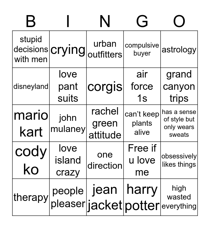This bingo card has 25 words: love island crazy, jean jacket, corgis, therapy, astrology, stupid decisions with men, disneyland, crying, can’t keep plants alive, one direction, air force 1s, mario kart, Free if u love me, obsessively likes things, love pant suits, high wasted everything, has a sense of style but only wears sweats, urban outfitters, grand canyon trips, john mulaney, rachel green attitude, people pleaser, cody ko, compulsive buyer and harry potter.