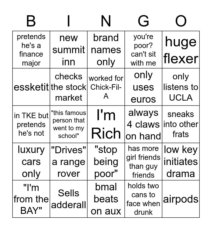 This bingo card has a free space and 24 words: "Drives" a range rover, Sells adderall, worked for Chick-Fil-A, "I'm from the BAY", huge flexer, pretends he's a finance major, essketit, new summit inn, always 4 claws on hand, "stop being poor", only uses euros, in TKE but pretends he's not, has more girl friends than guy friends, low key initiates drama, checks the stock market, holds two cans to face when drunk, sneaks into other frats, brand names only, only listens to UCLA, "this famous person that went to my school", airpods, luxury cars only, you're poor? can't sit with me and bmal beats on aux.