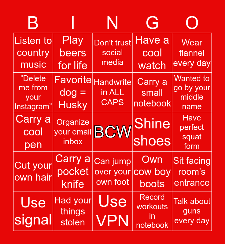 This bingo card has a free space and 24 words: Use signal, Carry a pocket knife, Handwrite in ALL CAPS, Record workouts in notebook, Wear flannel every day, Listen to country music, Play beers for life, Don’t trust social media, Shine shoes, Have perfect squat form, Carry a cool pen, Favorite dog = Husky, Own cow boy boots, Sit facing room’s entrance, “Delete me from your Instagram”, Had your things stolen, Use VPN, Have a cool watch, Wanted to go by your middle name, Cut your own hair, Organize your email inbox, Can jump over your own foot, Carry a small notebook and Talk about guns every day.