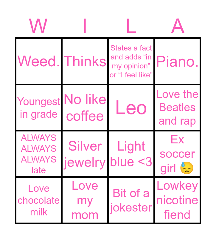 This bingo card has 16 words: Love chocolate milk, Love my mom, States a fact and adds “in my opinion” or “I feel like”, Piano., Youngest in grade, Thinks, Light blue <3, Ex soccer girl 😓, Weed., No like coffee, Bit of a jokester, Love the Beatles and rap, ALWAYS ALWAYS ALWAYS late, Silver jewelry, Leo and Lowkey nicotine fiend.