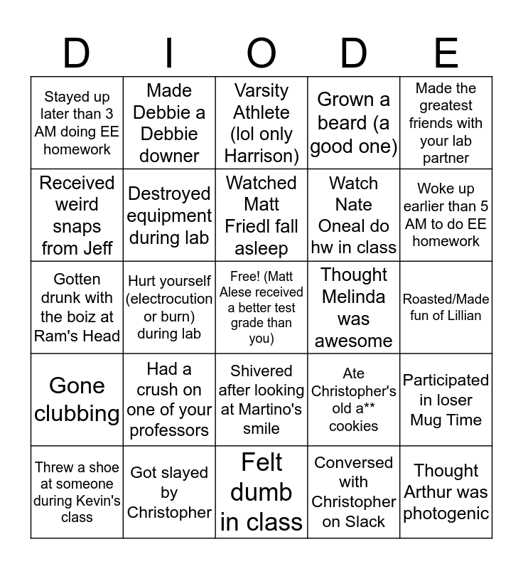 This bingo card has a free space and 24 words: Had a crush on one of your professors, Got slayed by Christopher, Watched Matt Friedl fall asleep, Threw a shoe at someone during Kevin's class, Made the greatest friends with your lab partner, Stayed up later than 3 AM doing EE homework, Received weird snaps from Jeff, Made Debbie a Debbie downer, Thought Melinda was awesome, Shivered after looking at Martino's smile, Watch Nate Oneal do hw in class, Gotten drunk with the boiz at Ram's Head, Ate Christopher's old a** cookies, Participated in loser Mug Time, Destroyed equipment during lab, Conversed with Christopher on Slack, Roasted/Made fun of Lillian, Varsity Athlete (lol only Harrison), Woke up earlier than 5 AM to do EE homework, Hurt yourself (electrocution or burn) during lab, Thought Arthur was photogenic, Gone clubbing, Grown a beard (a good one) and Felt dumb in class.