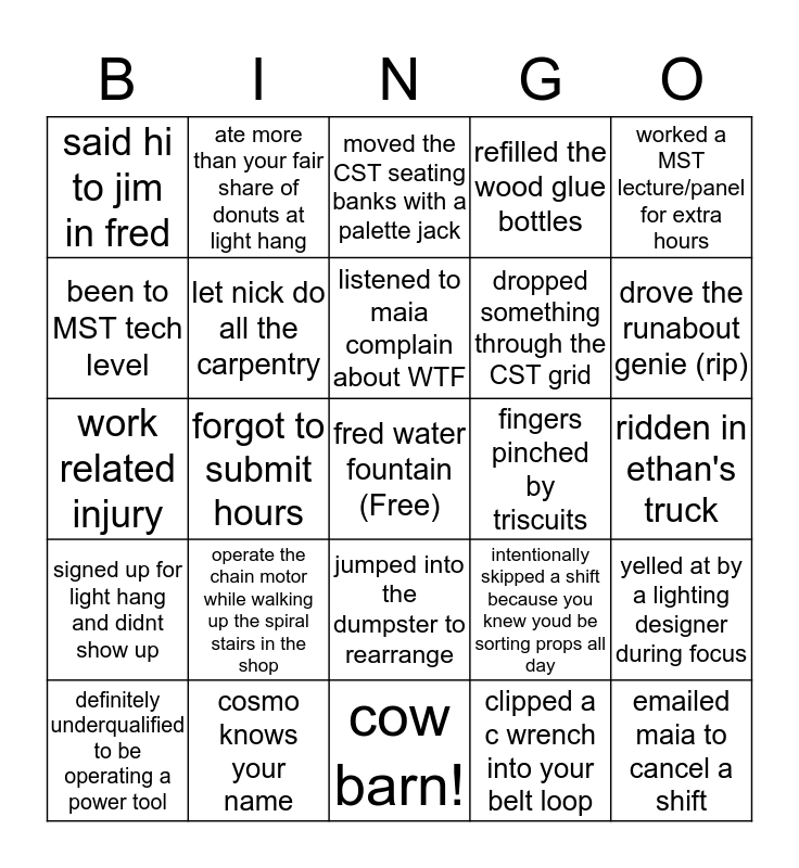 This bingo card has a free space and 24 words: operate the chain motor while walking up the spiral stairs in the shop, cosmo knows your name, listened to maia complain about WTF, definitely underqualified to be operating a power tool, worked a MST lecture/panel for extra hours, said hi to jim in fred, been to MST tech level, ate more than your fair share of donuts at light hang, fingers pinched by triscuits, jumped into the dumpster to rearrange, dropped something through the CST grid, work related injury, intentionally skipped a shift because you knew youd be sorting props all day, yelled at by a lighting designer during focus, let nick do all the carpentry, clipped a c wrench into your belt loop, ridden in ethan's truck, moved the CST seating banks with a palette jack, drove the runabout genie (rip), forgot to submit hours, emailed maia to cancel a shift, signed up for light hang and didnt show up, refilled the wood glue bottles and cow barn!.