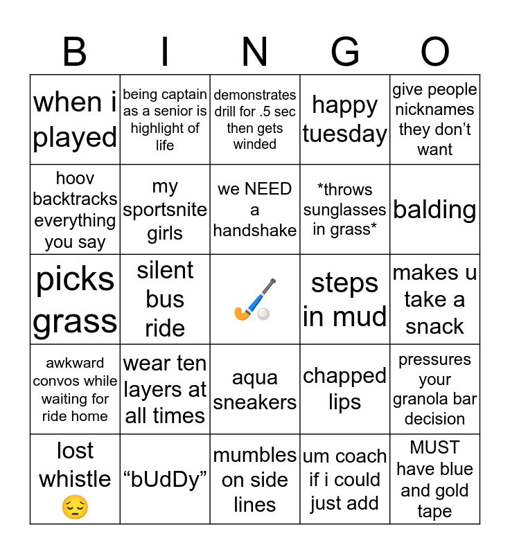 This bingo card has a free space and 24 words: wear ten layers at all times, “bUdDy”, we NEED a handshake, lost whistle😔, give people nicknames they don’t want, when i played, hoov backtracks everything you say, being captain as a senior is highlight of life, steps in mud, aqua sneakers, *throws sunglasses in grass*, picks grass, chapped lips, pressures your granola bar decision, my sportsnite girls, um coach if i could just add, makes u take a snack, demonstrates drill for .5 sec then gets winded, balding, silent bus ride, MUST have blue and gold tape, awkward convos while waiting for ride home, happy tuesday and mumbles on side lines.