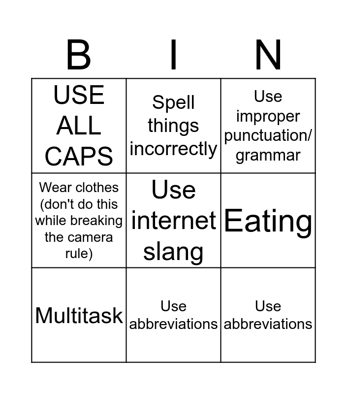 This bingo card has a free space and 8 words: Eating, Use improper punctuation/ grammar, Spell things incorrectly, Multitask, USE ALL CAPS, Use abbreviations, Wear clothes (don't do this while breaking the camera rule) and Use abbreviations.