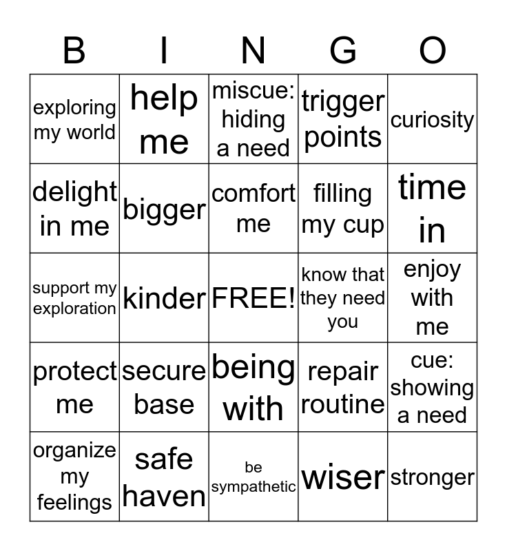 This bingo card has a free space and 24 words: secure base, safe haven, comfort me, organize my feelings, curiosity, exploring my world, delight in me, help me, know that they need you, being with, filling my cup, support my exploration, repair routine, cue: showing a need, bigger, wiser, enjoy with me, miscue: hiding a need, time in, kinder, stronger, protect me, trigger points and be sympathetic.