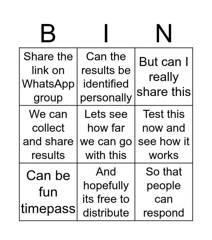 This bingo card has a free space and 8 words: Test this now and see how it works, But can I really share this, Can the results be identified personally, Can be fun timepass, Share the link on WhatsApp group, So that people can respond, We can collect and share results and And hopefully its free to distribute.