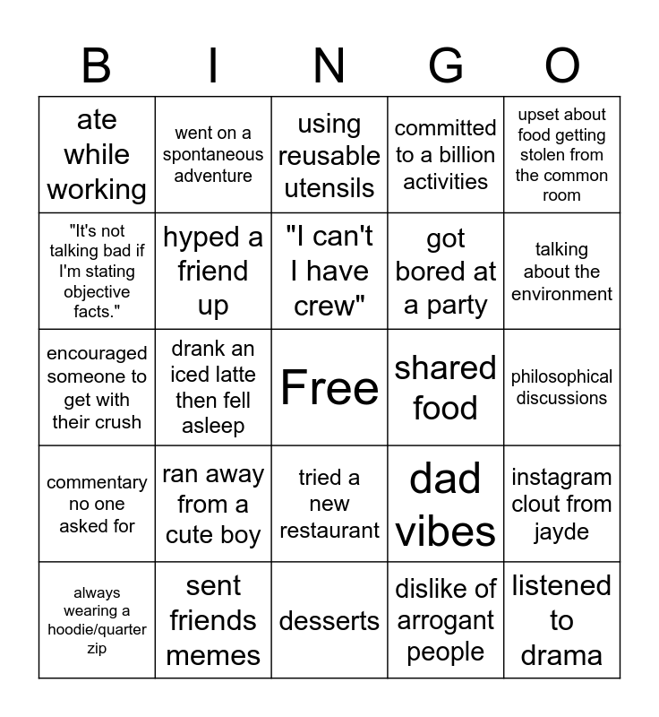 This bingo card has a free space and 24 words: ran away from a cute boy, sent friends memes, "I can't I have crew", always wearing a hoodie/quarter zip, upset about food getting stolen from the common room, ate while working, "It's not talking bad if I'm stating objective facts.", went on a spontaneous adventure, shared food, tried a new restaurant, got bored at a party, encouraged someone to get with their crush, dad vibes, instagram clout from jayde, hyped a friend up, dislike of arrogant people, philosophical discussions, using reusable utensils, talking about the environment, drank an iced latte then fell asleep, listened to drama, commentary no one asked for, committed to a billion activities and desserts.