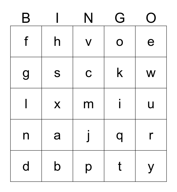 This bingo card has a free space and 24 words: a, b, c, d, e, f, g, h, i, j, k, l, q, r, s, t, u, v, w, x, y, n, o and p.