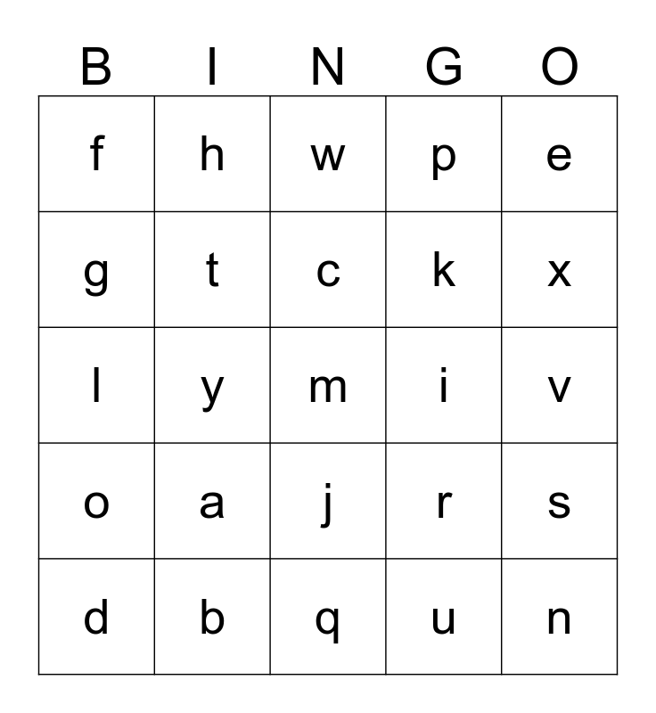 This bingo card has a free space and 24 words: a, b, c, d, e, f, g, h, i, j, k, l, r, s, t, u, v, w, x, y, n, o, p and q.