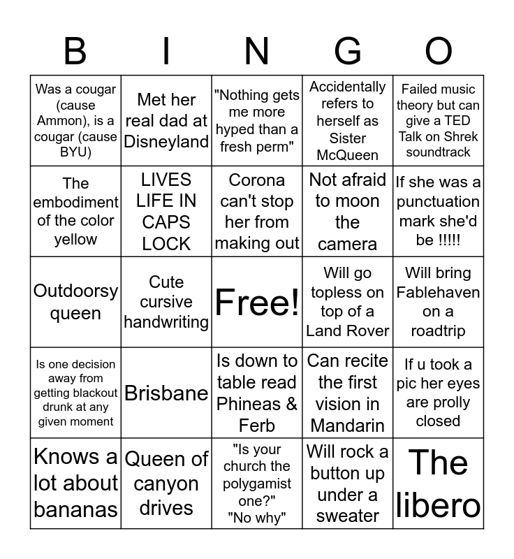 This bingo card has a free space and 24 words: Brisbane, Queen of canyon drives, Corona can't stop her from making out, Knows a lot about bananas, Failed music theory but can give a TED Talk on Shrek soundtrack, Was a cougar (cause Ammon), is a cougar (cause BYU), The embodiment of the color yellow, Met her real dad at Disneyland, Will go topless on top of a Land Rover, Is down to table read Phineas & Ferb, Not afraid to moon the camera, Outdoorsy queen, Can recite the first vision in Mandarin, If u took a pic her eyes are prolly closed, LIVES LIFE IN CAPS LOCK, Will rock a button up under a sweater, Will bring Fablehaven on a roadtrip, "Nothing gets me more hyped than a fresh perm", If she was a punctuation mark she'd be !!!!!, Cute cursive handwriting, The libero, Is one decision away from getting blackout drunk at any given moment, Accidentally refers to herself as Sister McQueen and "Is your church the polygamist one?" "No why".
