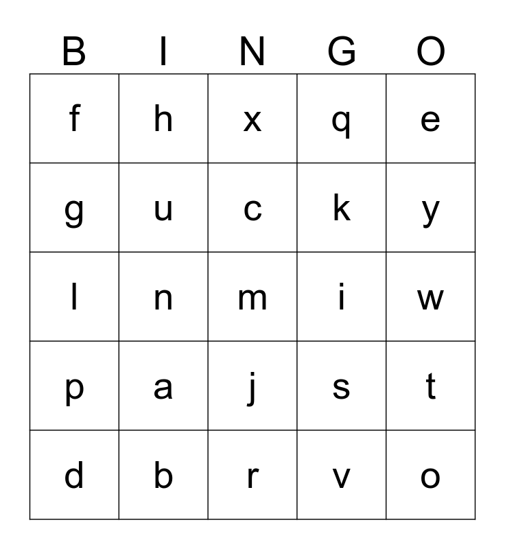 This bingo card has a free space and 24 words: a, b, c, d, e, f, g, h, i, j, k, l, s, t, u, v, w, x, y, n, o, p, q and r.