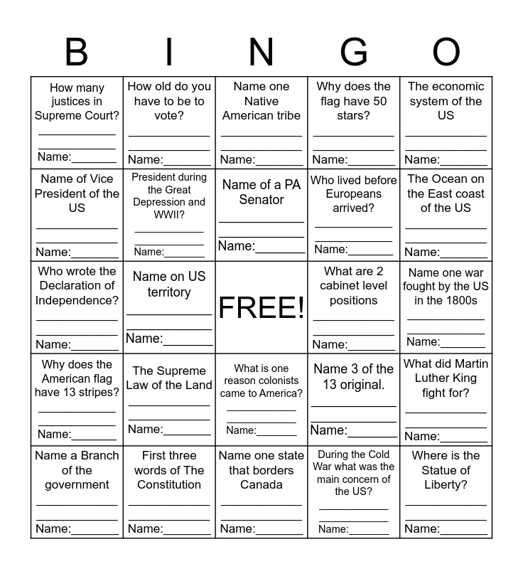 This bingo card has a free space and 24 words: The Supreme Law of the Land ____________ ____________ Name:_______, First three words of The Constitution ____________ ____________ Name:_______, Name of a PA Senator ____________ ____________ Name:_______, Name a Branch of the government ____________ ____________ Name:_______, The economic system of the US ____________ ____________ Name:_______, How many justices in Supreme Court? ____________ ____________ Name:_______, Name of Vice President of the US ____________ ____________ Name:_______, How old do you have to be to vote? ____________ ____________ Name:_______, What are 2 cabinet level positions ____________ ____________ Name:_______, What is one reason colonists came to America? ____________ ____________ Name:_______, Who lived before Europeans arrived? ____________ ____________ Name:_______, Who wrote the Declaration of Independence? ____________ ____________ Name:_______, Name 3 of the 13 original. ____________ ____________ Name:_______, What did Martin Luther King fight for? ____________ ____________ Name:_______, President during the Great Depression and WWII?____________ ____________ Name:_______, During the Cold War what was the main concern of the US?____________ ____________ Name:_______, Name one war fought by the US in the 1800s ____________ ____________ Name:_______, Name one Native American tribe ____________ ____________ Name:_______, The Ocean on the East coast of the US ____________ ____________ Name:_______, Name on US territory ____________ ____________ Name:_______, Where is the Statue of Liberty? ____________ ____________ Name:_______, Why does the American flag have 13 stripes? ____________ ____________ Name:_______, Why does the flag have 50 stars? ____________ ____________ Name:_______ and Name one state that borders Canada ____________ ____________ Name:_______.