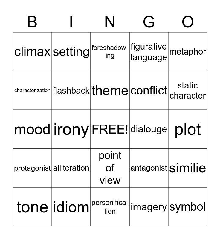 This bingo card has a free space and 24 words: alliteration, idiom, theme, tone, metaphor, climax, characterization, setting, dialouge, point of view, conflict, mood, antagonist, similie, flashback, imagery, plot, foreshadow-ing, static character, irony, symbol, protagonist, figurative language and personifica-tion.