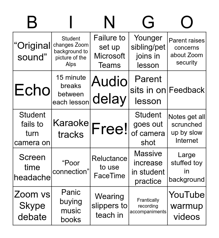 This bingo card has a free space and 24 words: Zoom vs Skype debate, “Poor connection”, Audio delay, Frantically recording accompaniments, Parent raises concerns about Zoom security, “Original sound”, Student changes Zoom background to picture of the Alps, Failure to set up Microsoft Teams, Student goes out of camera shot, Notes get all scrunched up by slow Internet, Student fails to turn camera on, 15 minute breaks between each lesson, Massive increase in student practice, Large stuffed toy in background, Echo, Panic buying music books, Wearing slippers to teach in, Younger sibling/pet joins in lesson, Feedback, Screen time headache, Karaoke tracks, Reluctance to use FaceTime, Parent sits in on lesson and YouTube warmup videos.