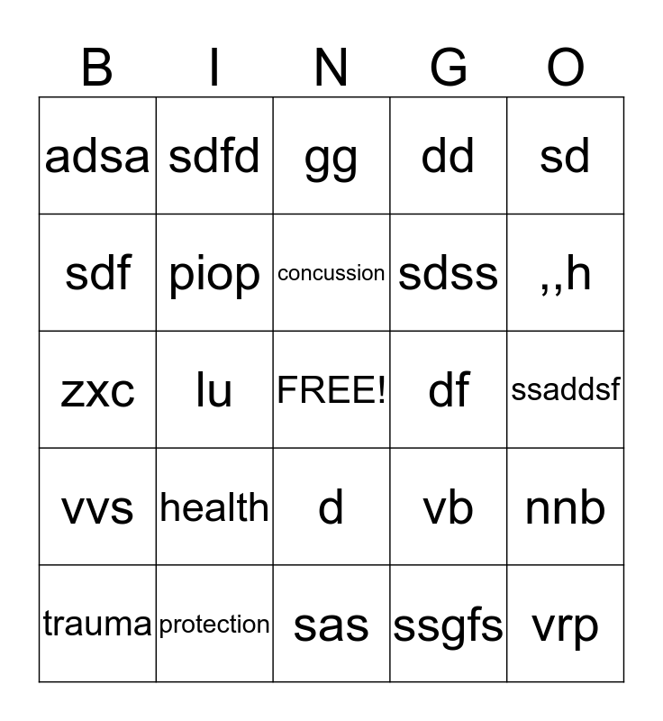 This bingo card has a free space and 24 words: health, protection, concussion, trauma, sd, adsa, sdf, sdfd, df, d, sdss, zxc, vb, nnb, piop, ssgfs, ssaddsf, gg, ,,h, lu, vrp, vvs, dd and sas.