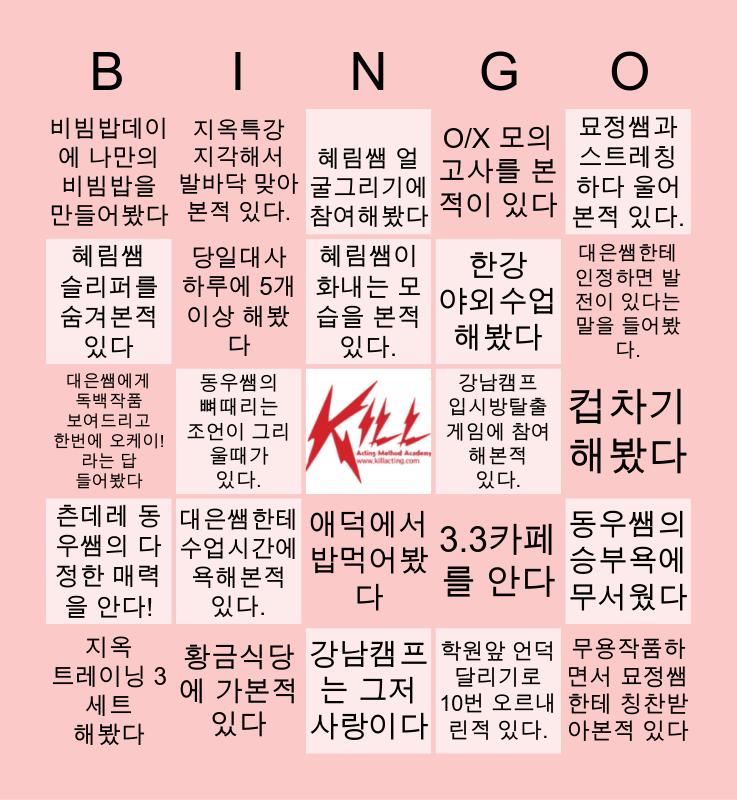 This bingo card has a free space and 24 words: 대은쌤한테 수업시간에 욕해본적 있다., 황금식당에 가본적 있다, 혜림쌤이 화내는 모습을 본적 있다., 지옥 트레이닝 3세트 해봤다, 묘정쌤과 스트레칭하다 울어본적 있다., 비빔밥데이에 나만의 비빔밥을 만들어봤다, 혜림쌤 슬리퍼를 숨겨본적 있다, 지옥특강 지각해서 발바닥 맞아본적 있다., 강남캠프 입시방탈출 게임에 참여해본적 있다., 애덕에서 밥먹어봤다, 한강 야외수업 해봤다, 대은쌤에게 독백작품 보여드리고 한번에 오케이!라는 답 들어봤다, 3.3카페를 안다, 동우쌤의 승부욕에 무서웠다, 당일대사 하루에 5개 이상 해봤다, 학원앞 언덕 달리기로 10번 오르내린적 있다., 컵차기해봤다, 혜림쌤 얼굴그리기에 참여해봤다, 대은쌤한테 인정하면 발전이 있다는 말을 들어봤다., 동우쌤의 뼈때리는 조언이 그리울때가 있다., 무용작품하면서 묘정쌤한테 칭찬받아본적 있다, 츤데레 동우쌤의 다정한 매력을 안다!, O/X 모의고사를 본적이 있다 and 강남캠프는 그저 사랑이다.