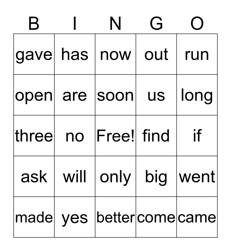 This bingo card has a free space and 24 words: will, yes, soon, made, run, gave, open, has, find, only, us, three, big, went, are, come, if, now, long, no, came, ask, out and better.