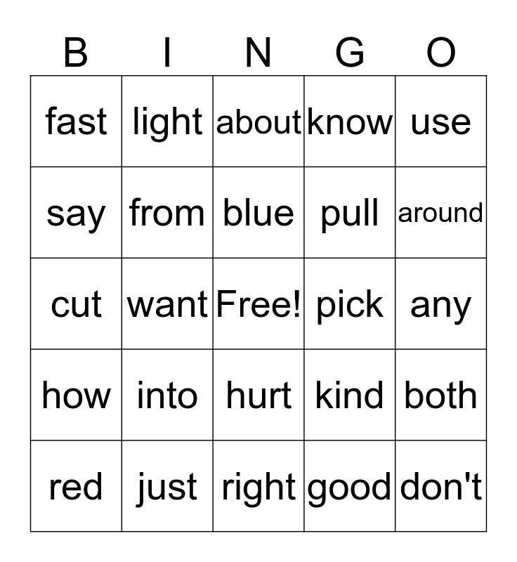 This bingo card has a free space and 24 words: into, just, blue, red, use, fast, say, light, pick, hurt, pull, cut, kind, both, from, good, any, about, around, want, don't, how, know and right.