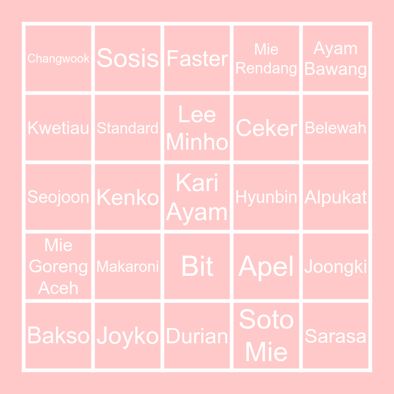 This bingo card has 25 words: Makaroni, Durian, Lee Minho, Bakso, Ayam Bawang, Changwook, Kwetiau, Sosis, Hyunbin, Bit, Ceker, Seojoon, Apel, Joongki, Standard, Sarasa, Alpukat, Faster, Belewah, Kenko, Kari Ayam, Joyko, Mie Goreng Aceh, Mie Rendang and Soto Mie.