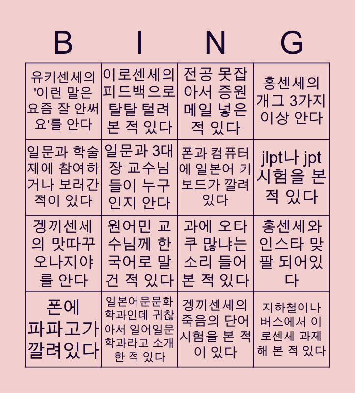 This bingo card has 16 words: 일본어문문화학과인데 귀찮아서 일어일문학과라고 소개한 적 있다, 홍센세와 인스타 맞팔 되어있다, 전공 못잡아서 증원 메일 넣은 적 있다, 유키센세의 '이런 말은 요즘 잘 안써요'를 안다, 겡끼센세의 맛따꾸 오나지야를 안다, 이로센세의 피드백으로 탈탈 털려본 적 있다, 과에 오타쿠 많냐는 소리 들어본 적 있다, 겡끼센세의 죽음의 단어시험을 본 적이 있다, 일문과 학술제에 참여하거나 보러간 적이 있다, 일문과 3대장 교수님들이 누구인지 안다, 폰에 파파고가 깔려있다, 홍센세의 개그 3가지 이상 안다, 원어민 교수님께 한국어로 말건 적 있다, jlpt나 jpt 시험을 본 적 있다, 폰과 컴퓨터에 일본어 키보드가 깔려있다 and 지하철이나 버스에서 이로센세 과제 해 본 적 있다.