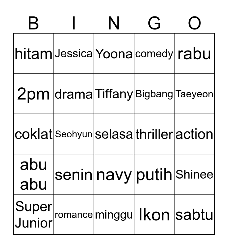This bingo card has a free space and 24 words: senin, romance, Tiffany, Super Junior, rabu, hitam, 2pm, Jessica, thriller, navy, Bigbang, coklat, putih, Shinee, drama, Ikon, action, Yoona, Taeyeon, Seohyun, sabtu, abu abu, comedy and minggu.