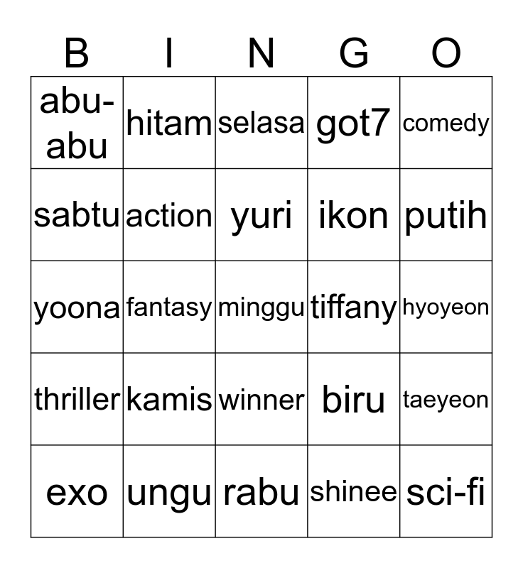 This bingo card has a free space and 24 words: kamis, ungu, yuri, exo, comedy, abu-abu, sabtu, hitam, tiffany, winner, ikon, yoona, biru, taeyeon, action, shinee, hyoyeon, selasa, putih, fantasy, sci-fi, thriller, got7 and rabu.