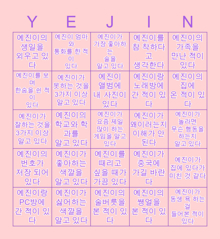 This bingo card has a free space and 24 words: 예진이가 좋아하는 색깔을 알고 있다, 예진이가 싫어하는 색깔을 알고 있다, 예진이 앨범에 내 사진이 있다, 예진이랑 PC방에 간 적이 있다, 예진이의 가족을 만난 적이 있다, 예진이의 생일을 외우고 있다, 예진이를 보며 한숨을 쉰 적이 있다, 예진이 엄마와 통화를 한 적이 있다, 예진이가 왜이러는지 이해가 안된다, 예진이를 때리고 싶을 때가 가끔 있다, 예진이랑 노래방에 간 적이 있다, 예진이가 잘하는 것을 3가지 이상 알고 있다, 예진이가 중국에 가길 바란다, 예진이가 집에 있다가 미친 것 같다, 예진이가 못하는 것을 3가지 이상 알고 있다, 예진이의 쌩얼을 본 적이 있다, 예진이가 놀라면 무슨 행동을 하는지 알고 있다, 예진이가 가장 좋아하는 술을 알고 있다, 예진이의 집에 온 적이 있다, 예진이의 학교와 학과를 알고 있다, 예진이가 동생 욕 하는 걸 들어본 적이 있다, 예진이의 번호가 저장 되어 있다, 예진이를 참 착하다고 생각한다 and 예진이의 술버릇을 본 적이 있다.