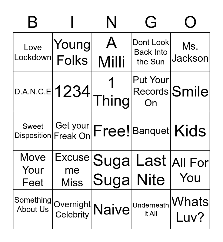 This bingo card has a free space and 24 words: Excuse me Miss, Overnight Celebrity, 1 Thing, Something About Us, Ms. Jackson, Love Lockdown, D.A.N.C.E, Young Folks, Banquet, Suga Suga, Put Your Records On, Sweet Disposition, Last Nite, All For You, 1234, Underneath it All, Kids, A Milli, Smile, Get your Freak On, Whats Luv?, Move Your Feet, Dont Look Back Into the Sun and Naive.
